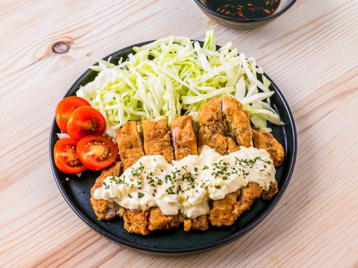 Chicken nanban is a Japanese dish consisting of deep-fried chicken that is marinated in a sweet and sour sauce made from vinegar, soy sauce, and sugar. It is typically served with tartar sauce and garnished with vegetables like lettuce and cucumber.